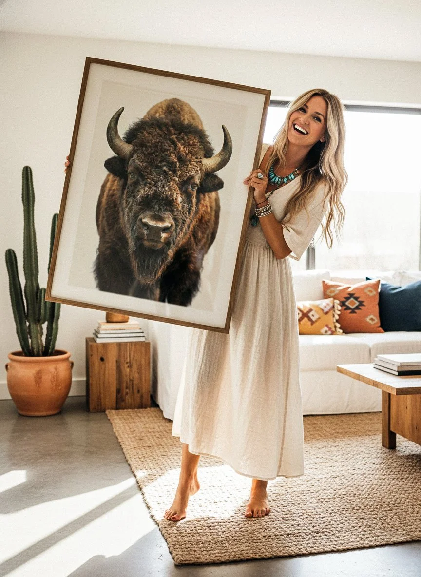 A direct portrait of an American bison — heavy coat, worn horns, and steady gaze set against a clean backdrop. The detail reveals age, texture, and presence without distraction. - All purchases come unframed (print only). - The design may vary slightly depending on the aspect ratio of your print.